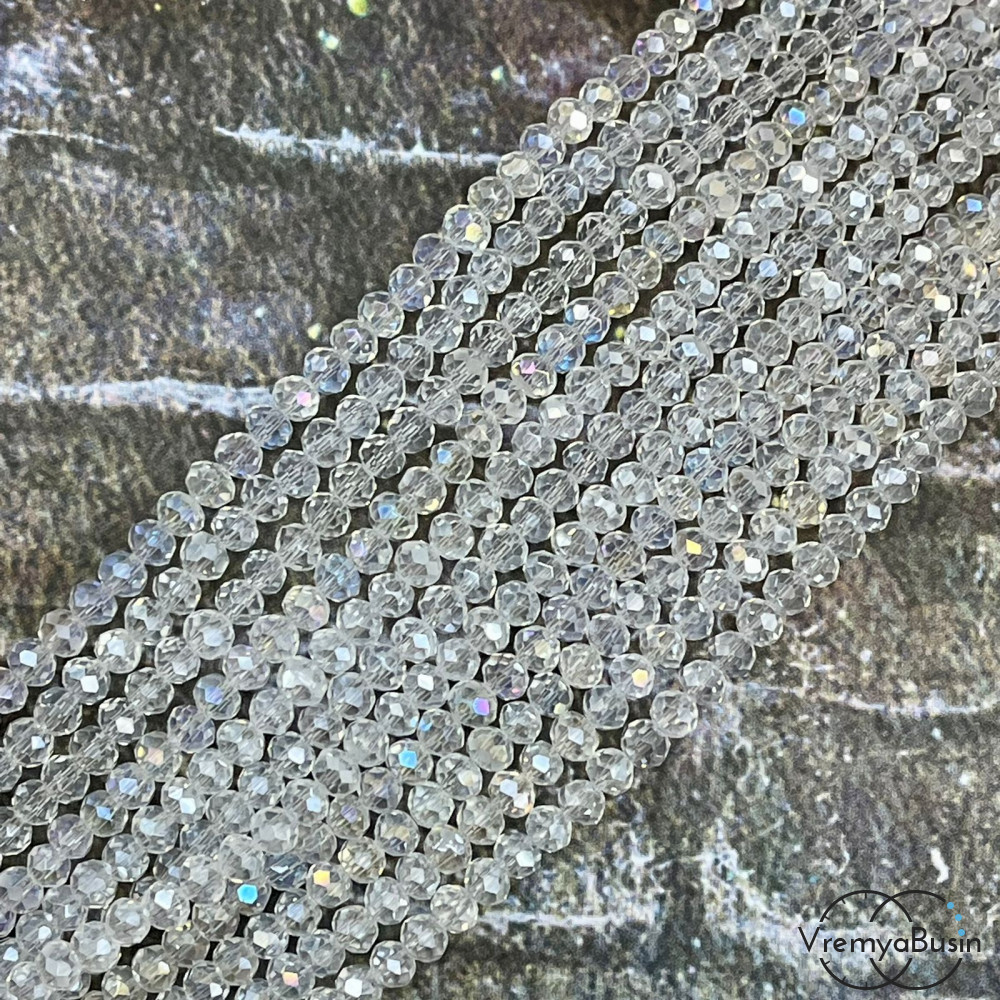 Бусины-рондели из граненого стекла, 3х4 мм, цв. прозрачный с АБ переливом (нить, ок. 130 шт.)