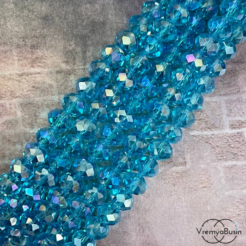 Бусины-рондели из граненого стекла, цв. бирюзовый с АБ переливом, размер 8 мм (нить, ок. 65 шт.)