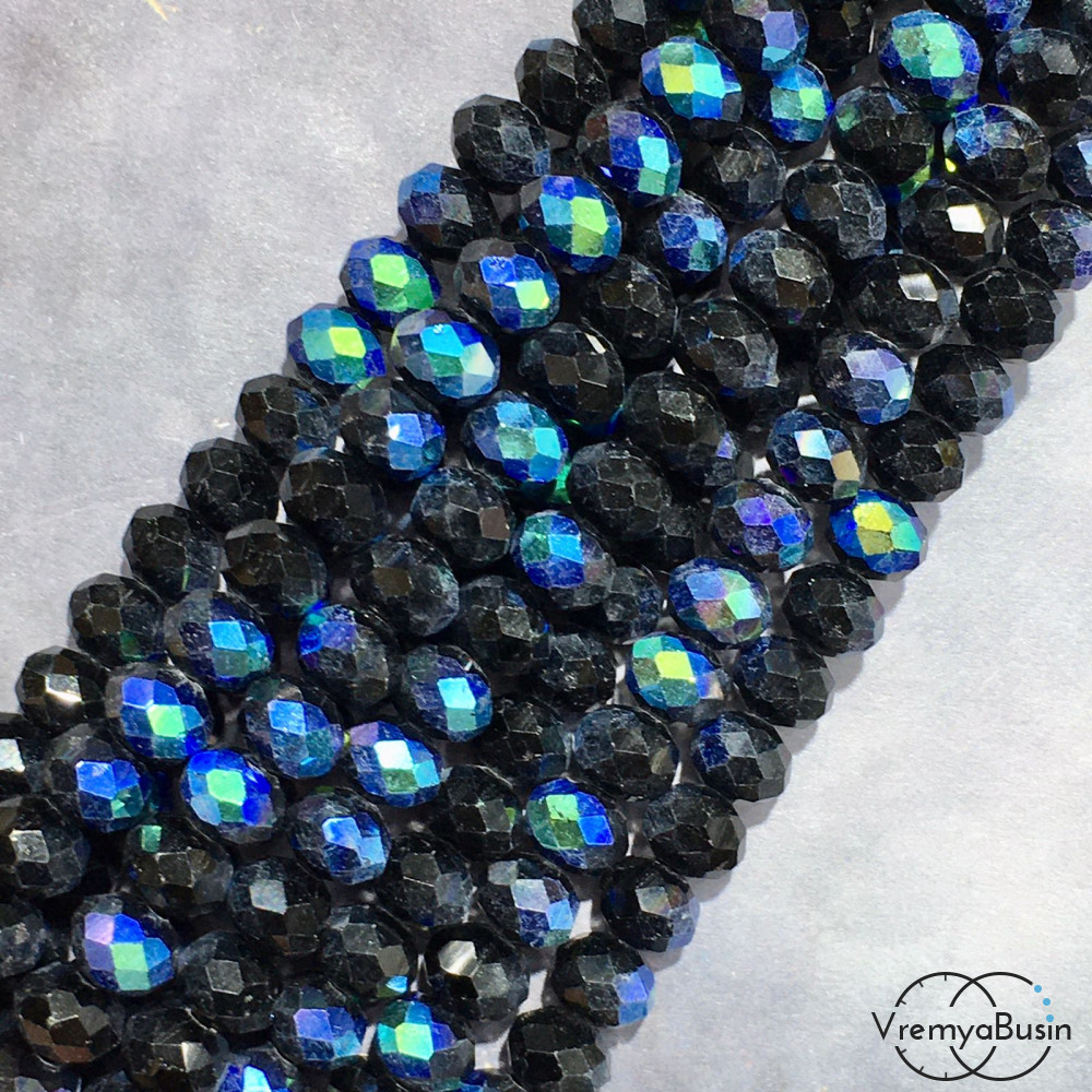• Бусины-рондели из граненого стекла, цв.  черный с бирюзовым переливом  , размер 8 мм   (нить, ок. 65  шт.)