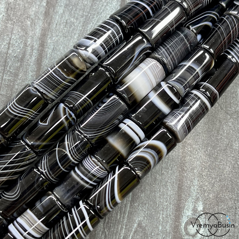 Агат черный полосатый, трубочка гладкая 8х16 мм (1/2 нити, ок. 12 шт.)