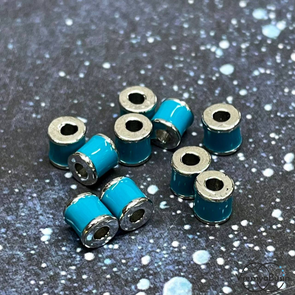 Бусины разделители с эмалью, трубочки 5х6 мм, родий, цв. бирюзовый (упак. 2 шт.)