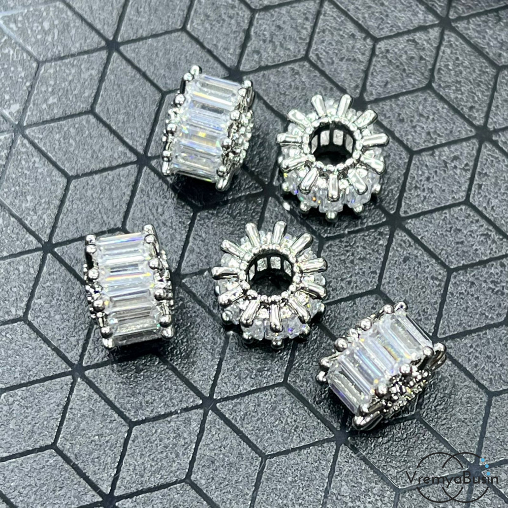 Бусина с фианитами, кольцо 6х9 мм, латунь с родиевым покрытием (1 шт.)