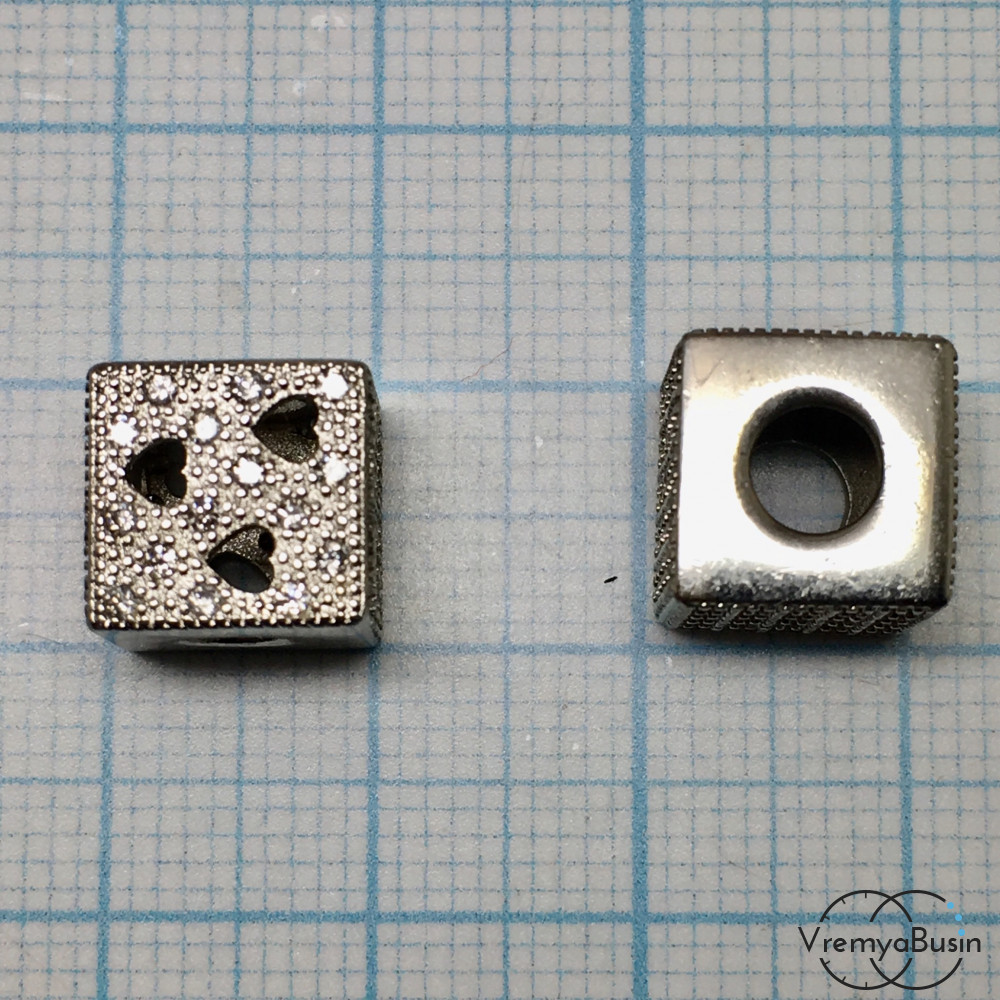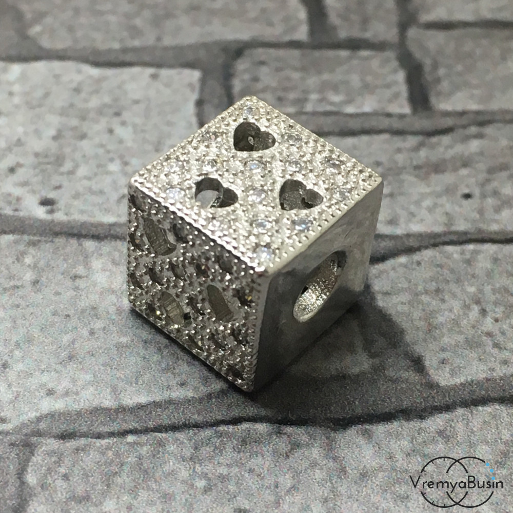 Бусина с фианитами "Кубик с сердечками", латунь с родиевым покрытием (1 шт.)