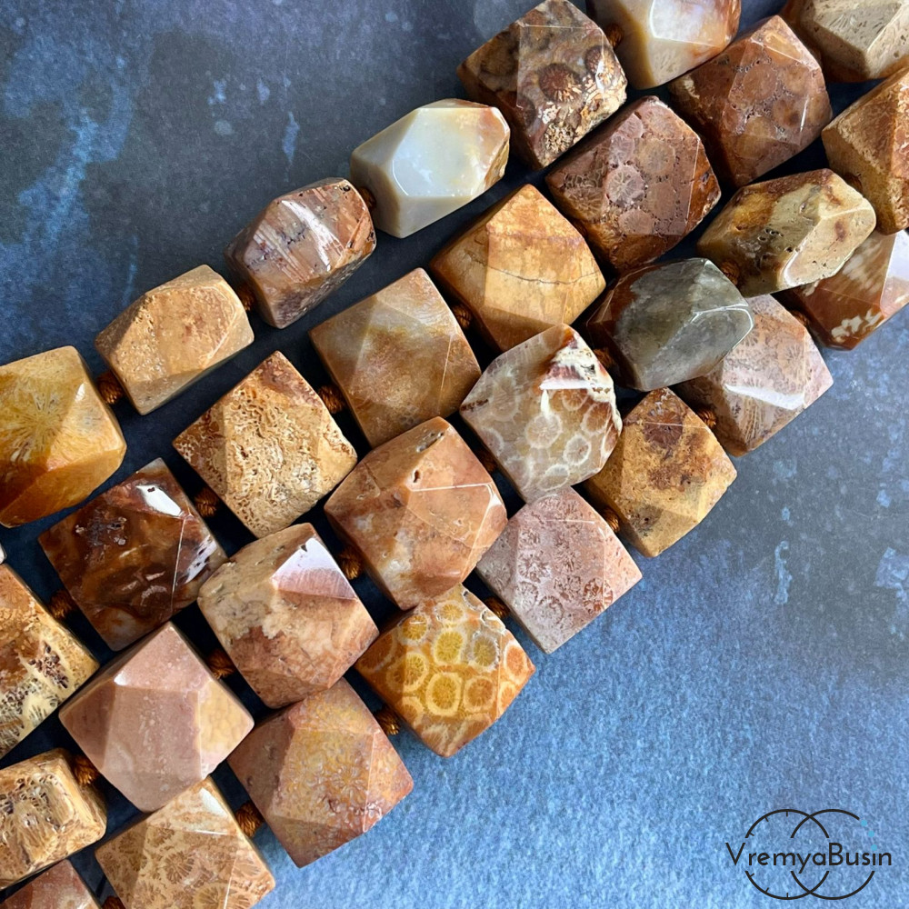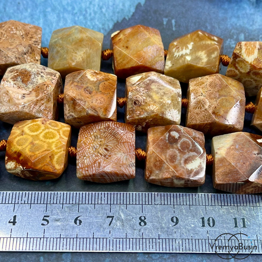 Коралл натур. окаменелый, квадратные бусины с гранями, ок. 18х18х12 мм (нить, ок. 20 шт.)