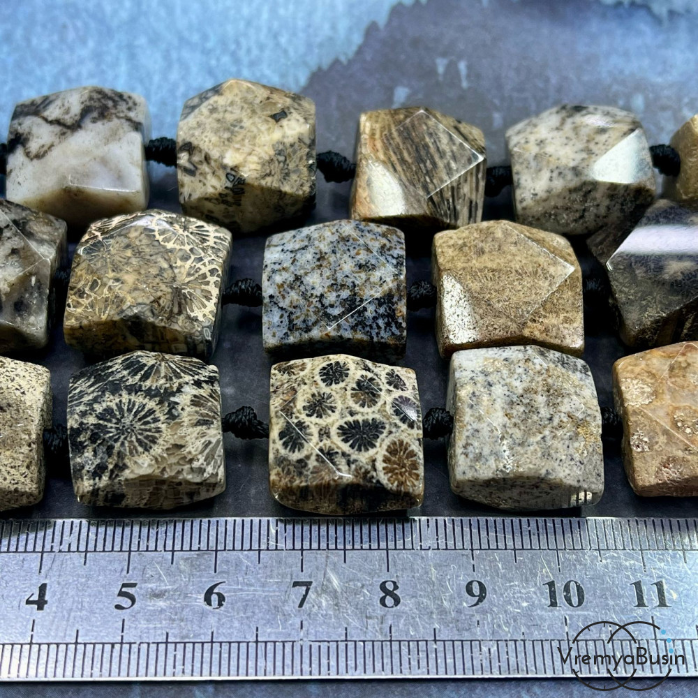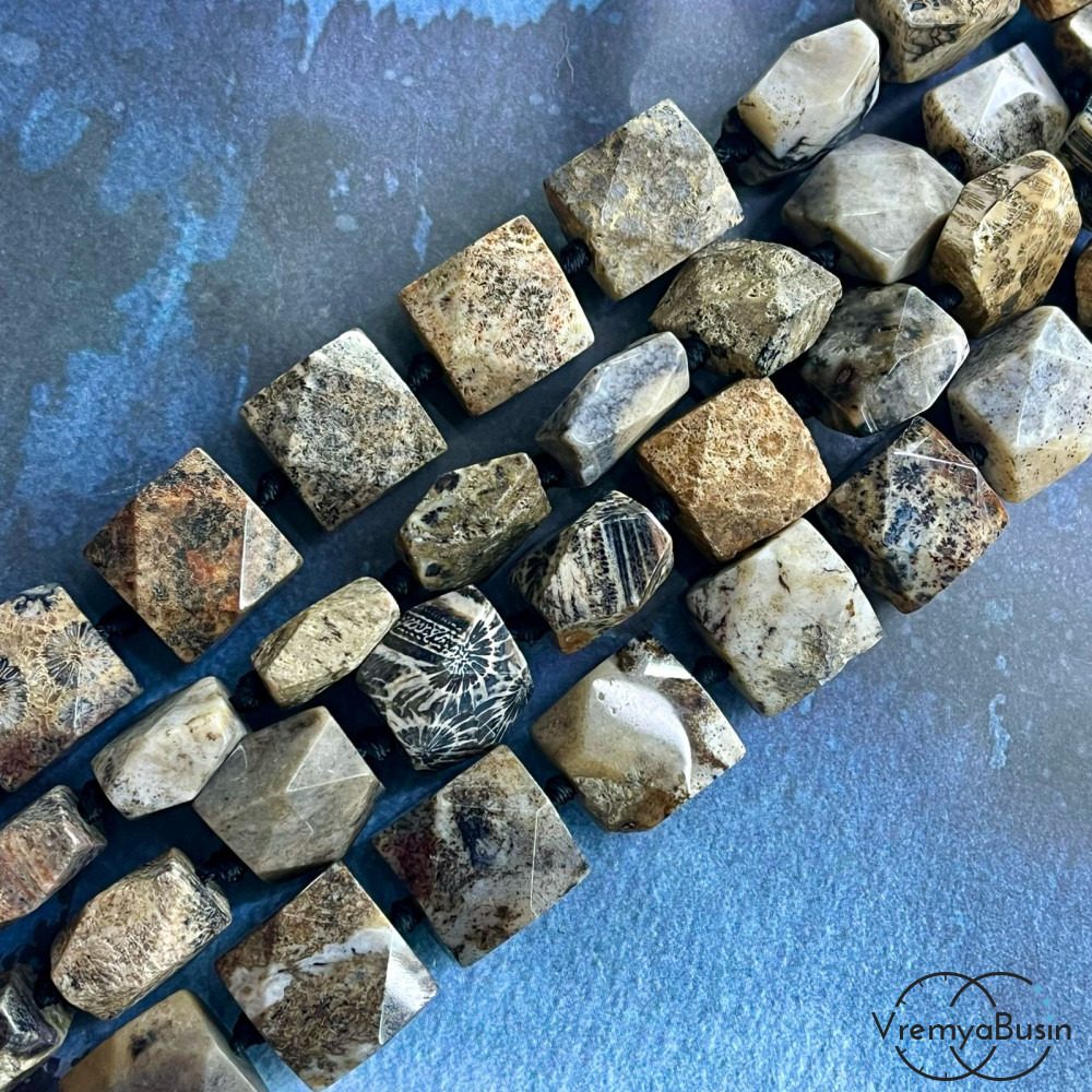 Коралл натур. окаменелый, квадратные бусины с гранями, ок. 18х18х12 мм (нить, ок. 20 шт.)