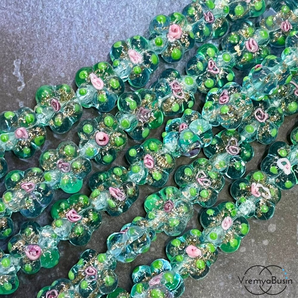 Бусины из стекла лэмпворк, цветочек 14х15х10 мм, цв. бирюзовый (1/2 нити, ок. 10 шт.)
