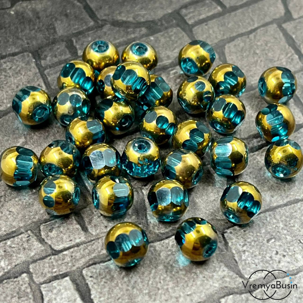 Бусины шарики с напылением, 8 мм, цв. бирюзовый с золотом (1 шт.)