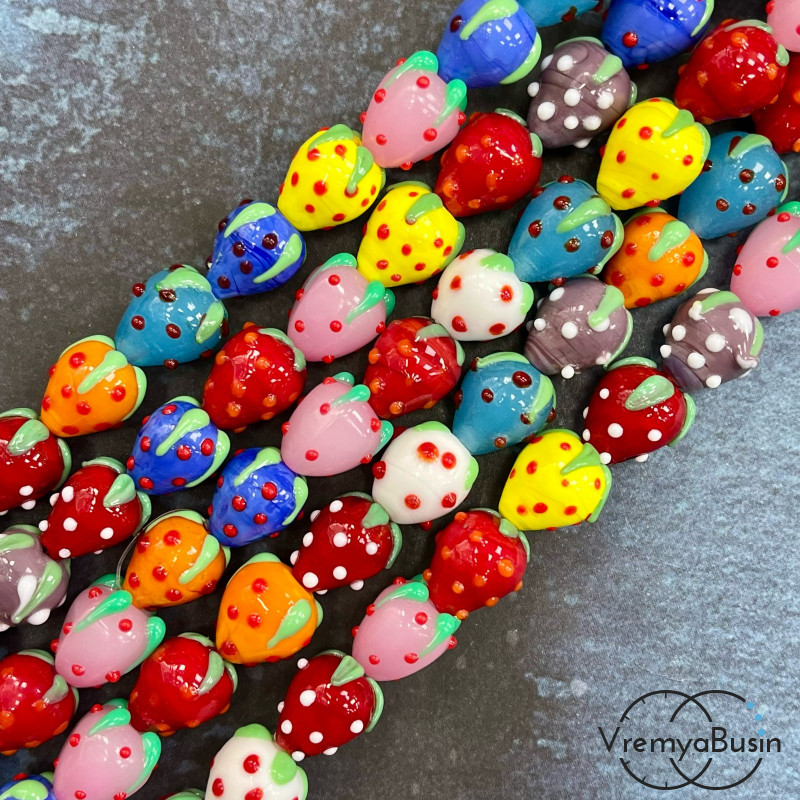 Бусины из стекла лэмпворк, клубника ок. 12х15 мм, цв. микс (1/2 нити, ок. 12 шт.)