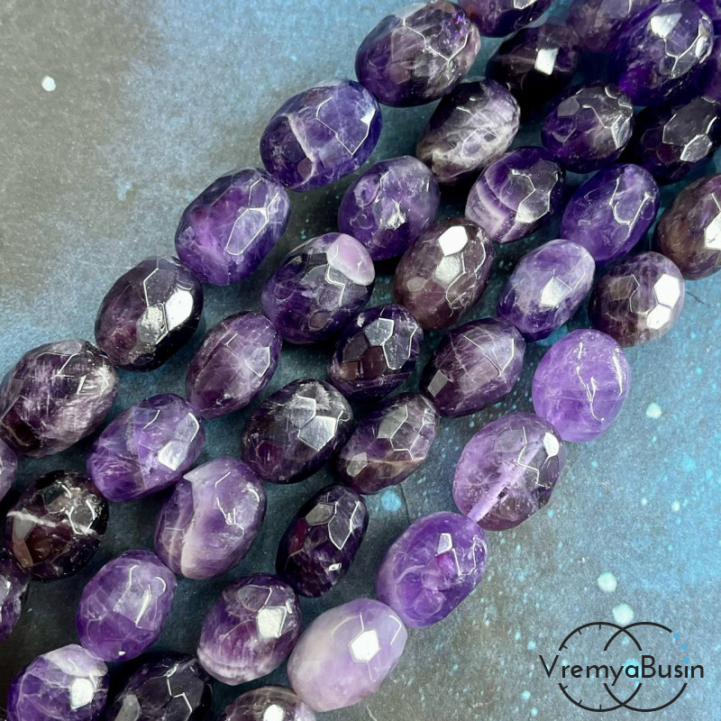 • Аметист, бочонок крупный граненый, ок. 15х20 мм (1/2 нити, 10 шт.)