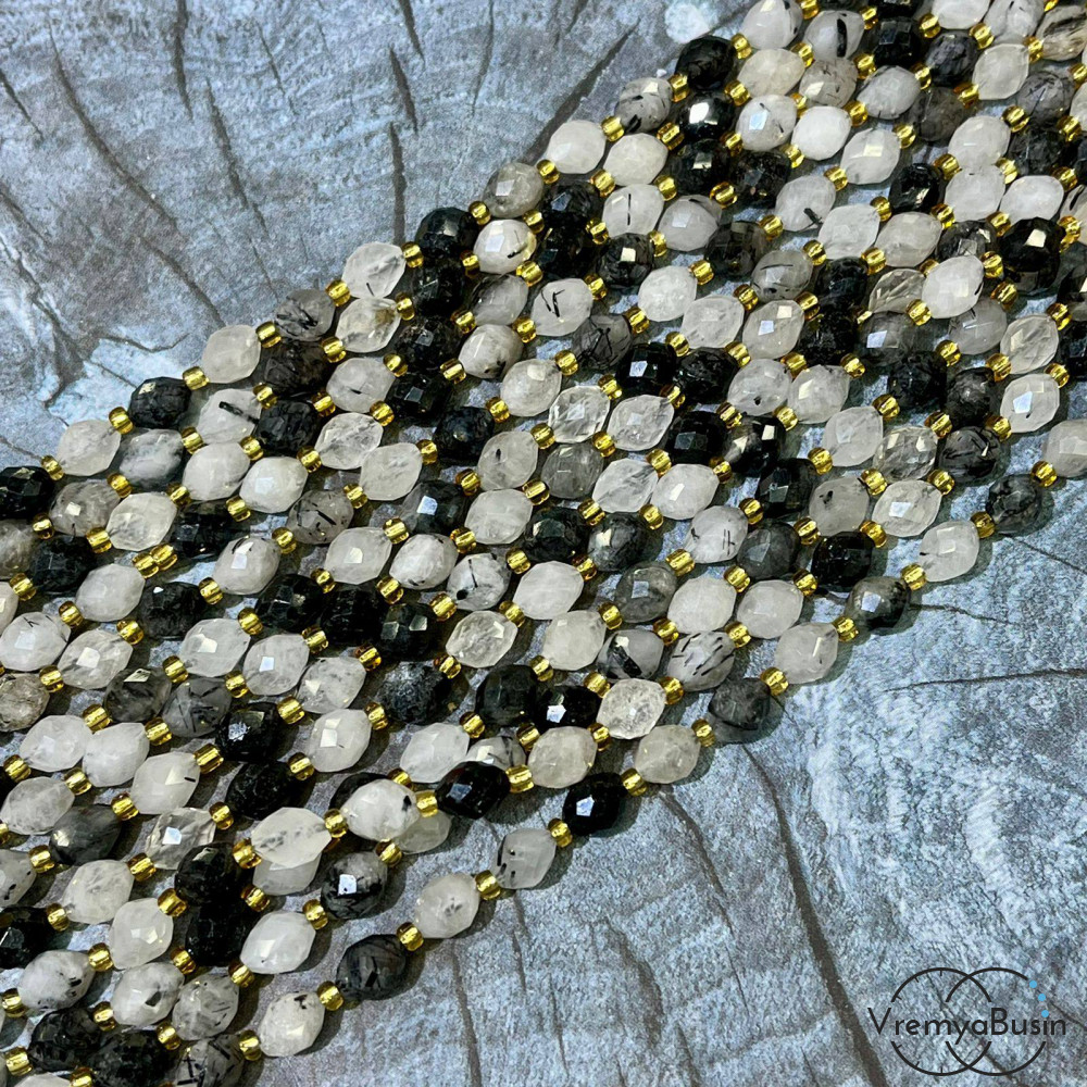 Рутиловый кварц волосатик, бочонок с ювелирной огранкой, ок. 6х8 мм (нить, ок. 38 шт.)