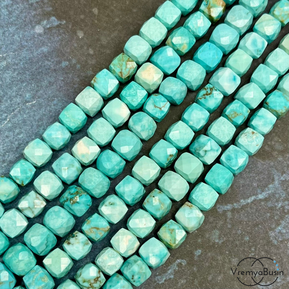 • Турквенит, кубик с ювелирной огранкой,     7х7  мм (1/2 нити, ок.   28    шт.)