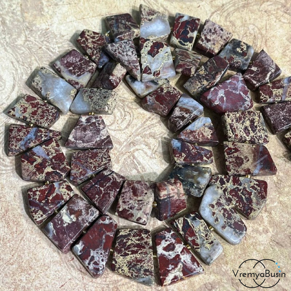 Яшма уральская, плоские бусины разной формы с градуировкой размера (колье, ок. 60 см.)