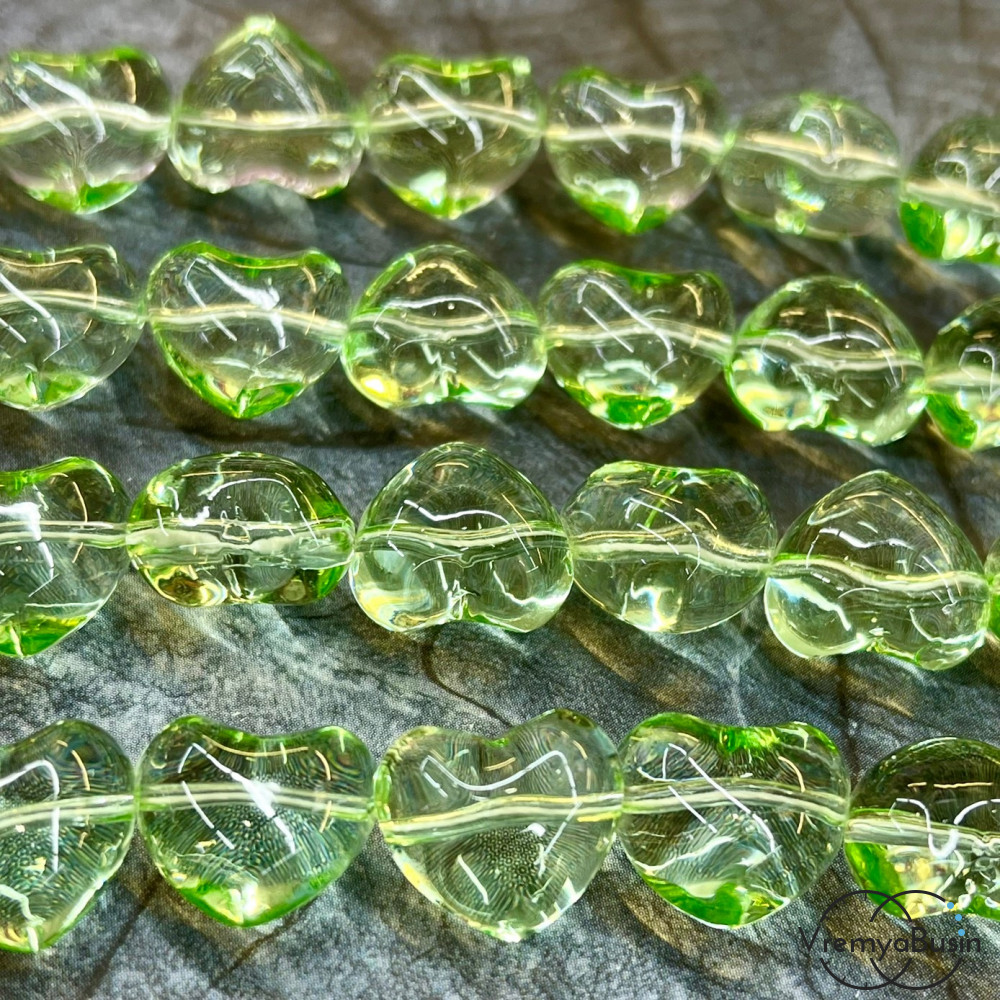 Сердце, бусины из стекла, 15х14х10 мм, цв. зеленый (1/2 нити, ок. 13 шт.)