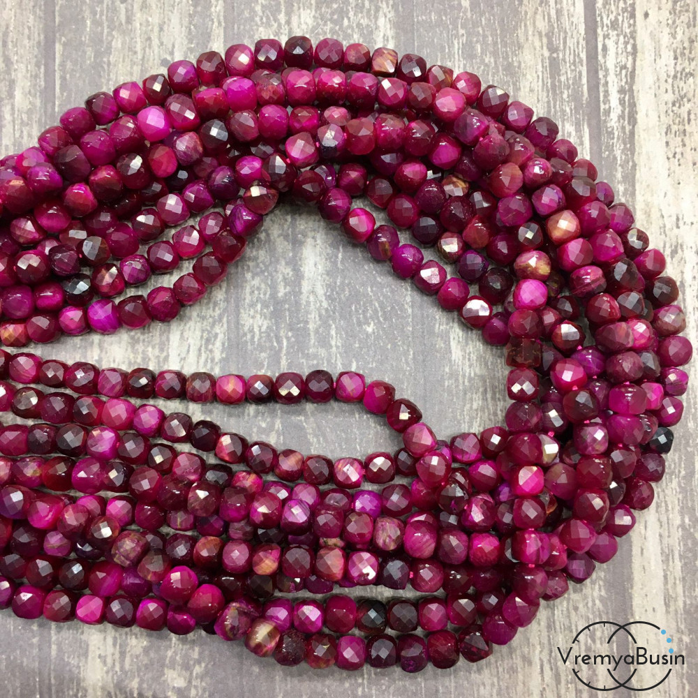 Тигровый глаз натур., тонир. цв. малиновый, кубик с ювелирной огранкой, 5х5 мм (1/2 нити, ок. 37 шт.)