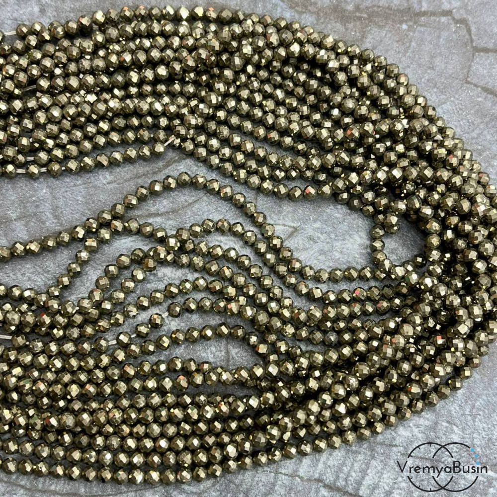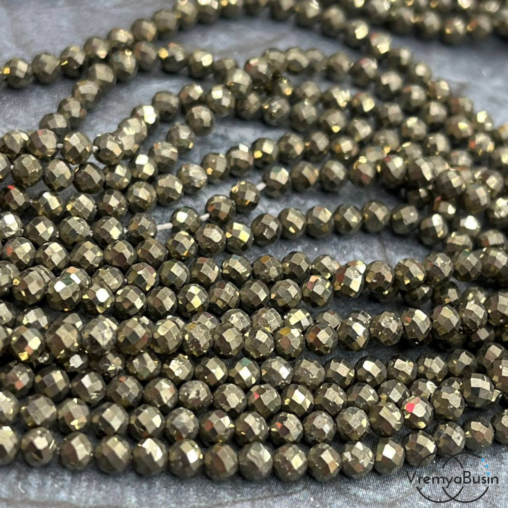 Пирит, мелкие бусины с микроогранкой, шарик 3 мм (нить, ок. 40 см.)