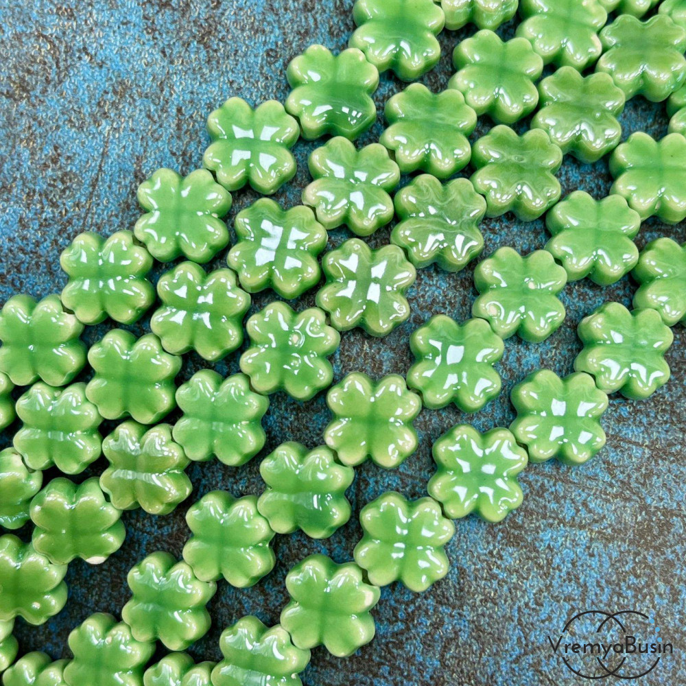Бусина керамическая "Клевер", 12х6 мм, цв. ЗЕЛЕНЫЙ (нить, ок. 30 шт.)