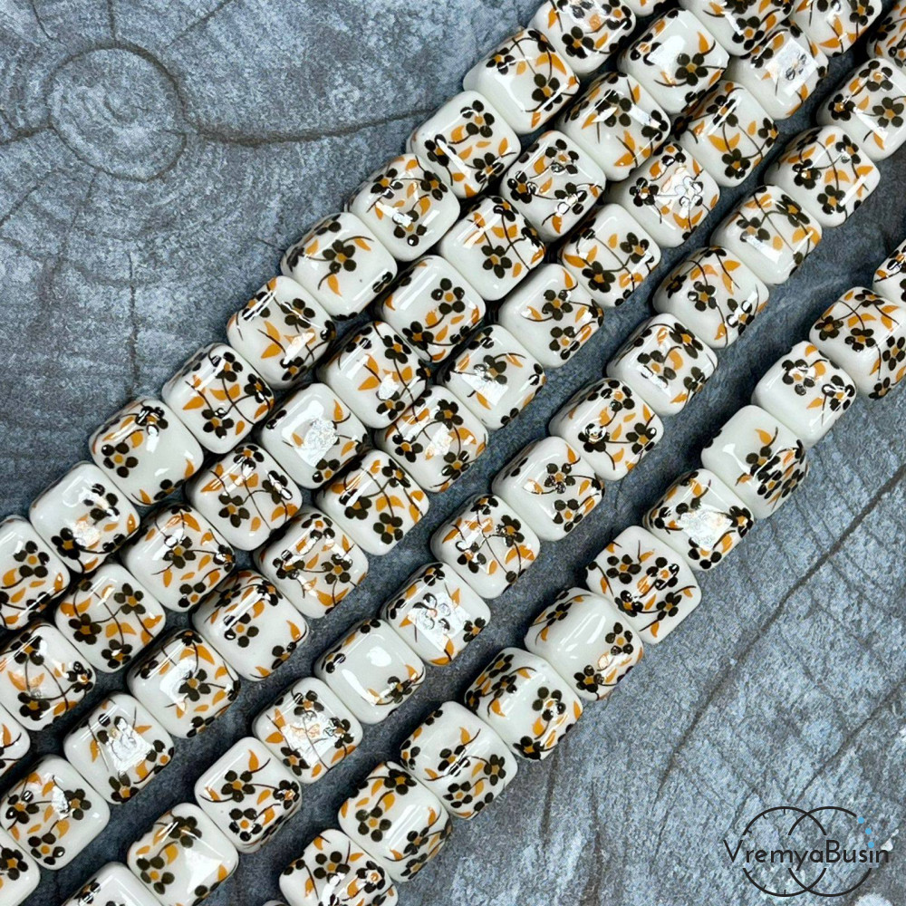 • Бусина керамическая с рисунком, кубик  8 мм (нить, ок. 42 шт.)