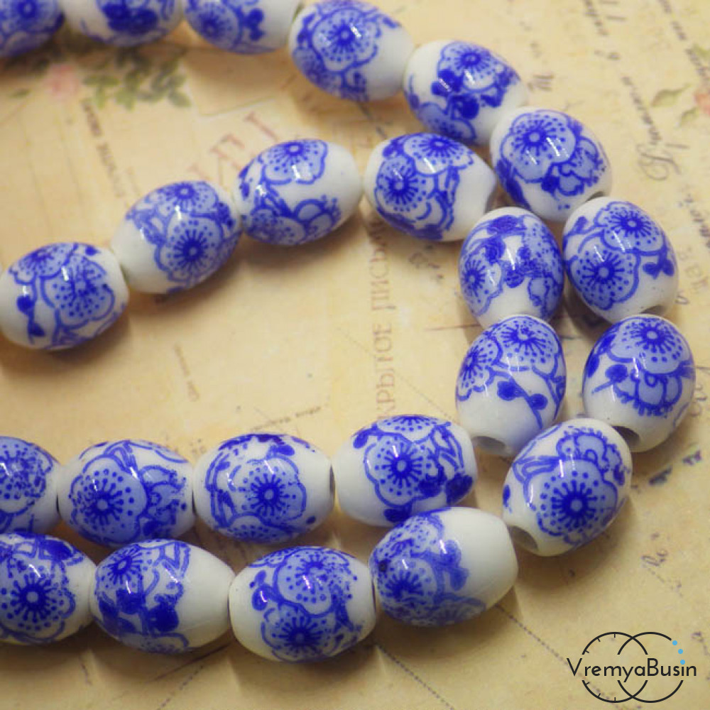 Бусины из фарфора с цветами, бочонок 8х10 мм (1 шт.)
