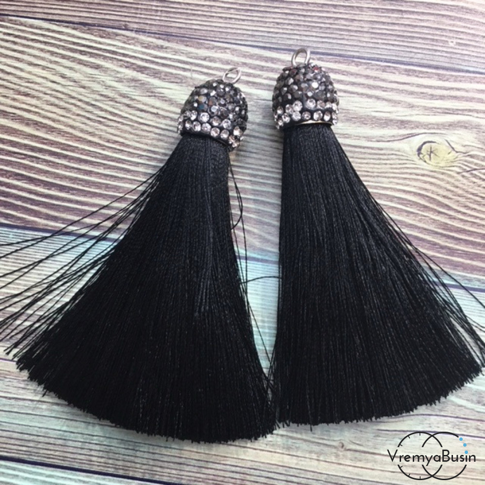 Подвески-кисточки из шелковой нити в шапочке со стразами, цв. ЧЕРНЫЙ (2 шт.)