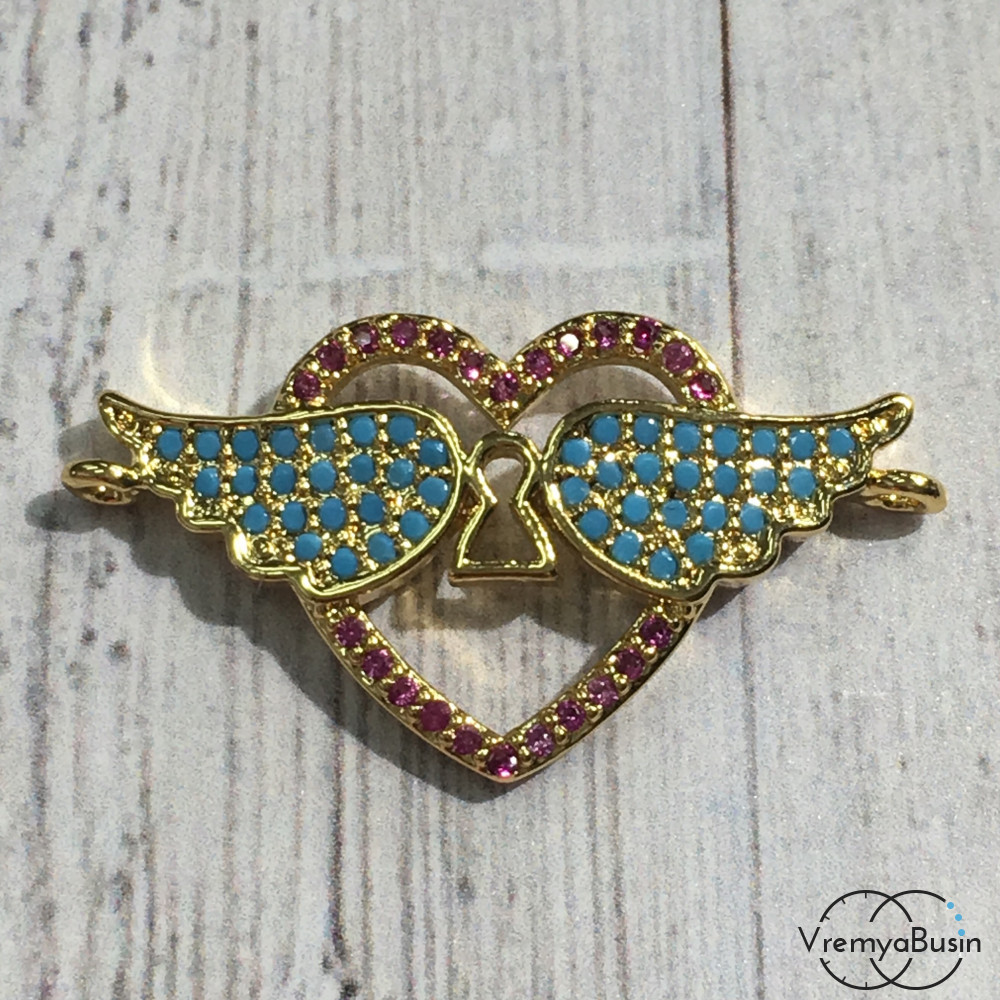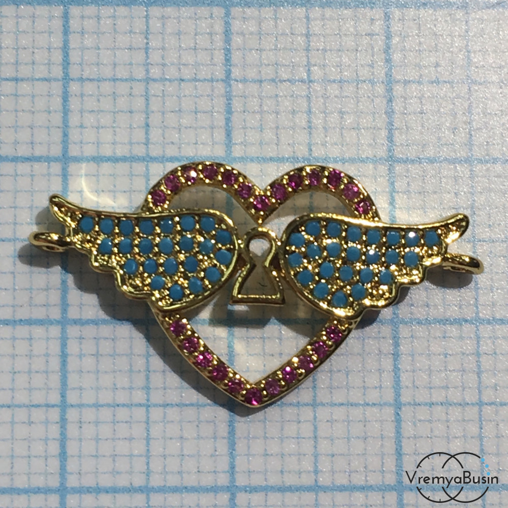 Коннектор "Сердце с крыльями" с цветными фианитами, латунь с позолотой (1 шт.)