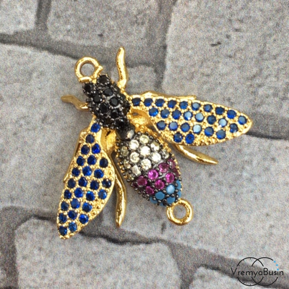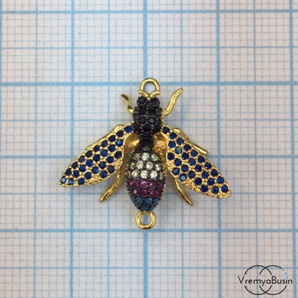 Коннектор с цветными фианитами "Насекомое", латунь с позолотой (1 шт.)