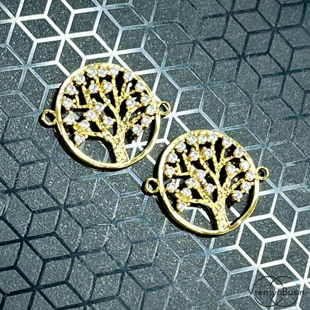 • Коннектор с фианитами"Дерево", 22х17 мм, латунь с позолотой (1 шт.)