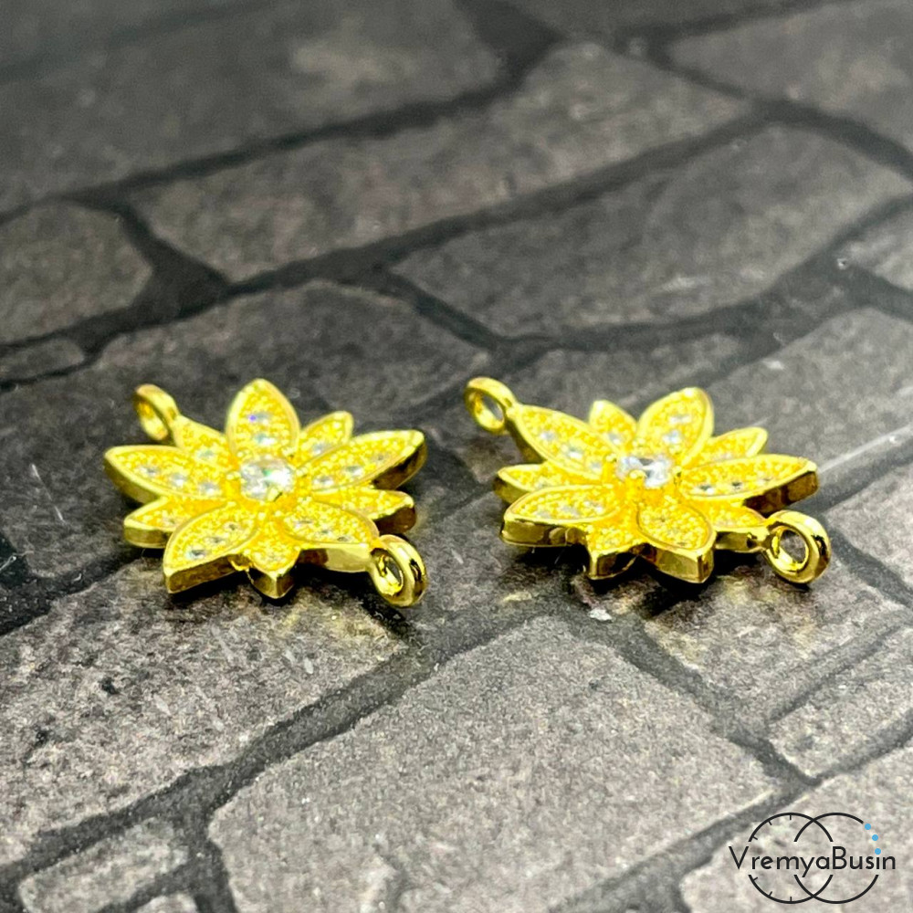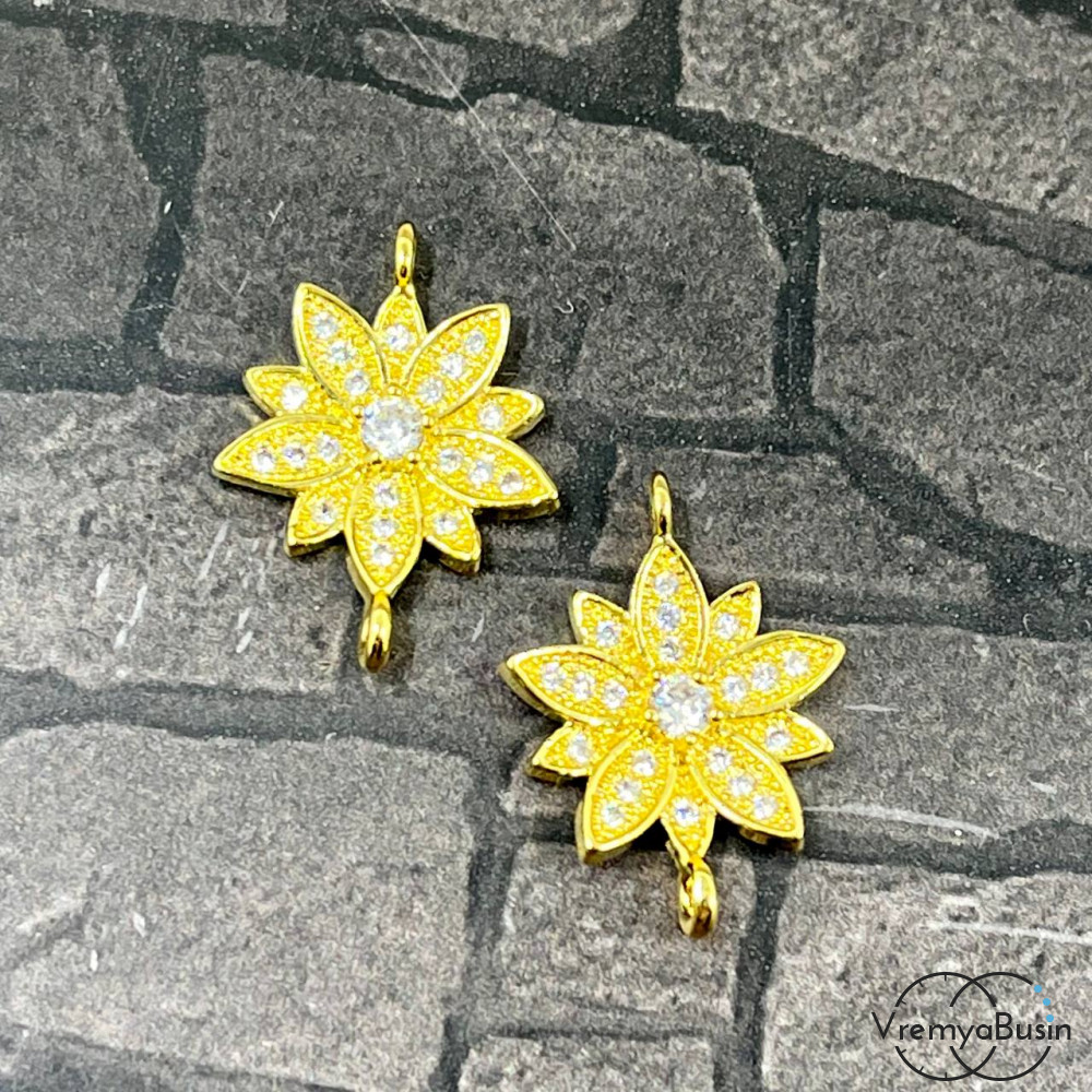 Коннектор с фианитами "Цветок", 15х20 мм, латунь с позолотой (1 шт.)