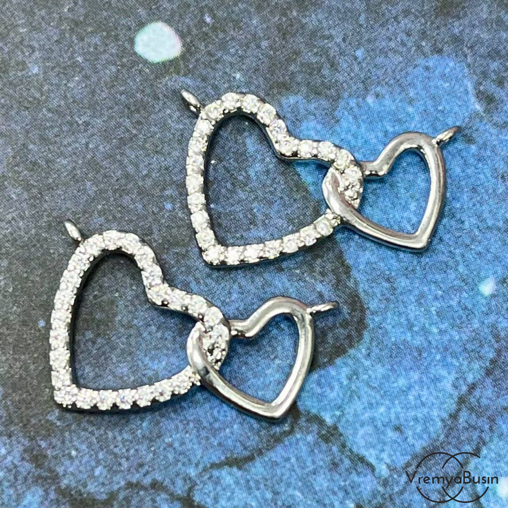 • Коннектор с фианитами «Два сердца», 13х20 мм, латунь с родиевым покрытием (1 шт.)