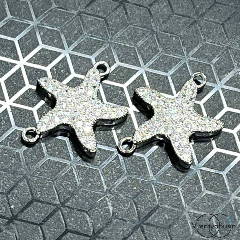 Коннектор с фианитами "Звезда", 21х16 мм, латунь с родиевым покрытием (1 шт.)