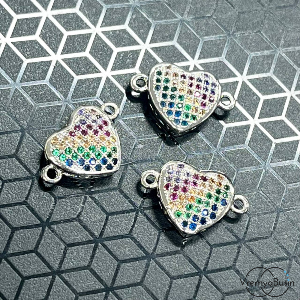 • Коннектор с фианитами "Сердце", 17х11 мм, латунь с родиевым покрытием (1 шт.)
