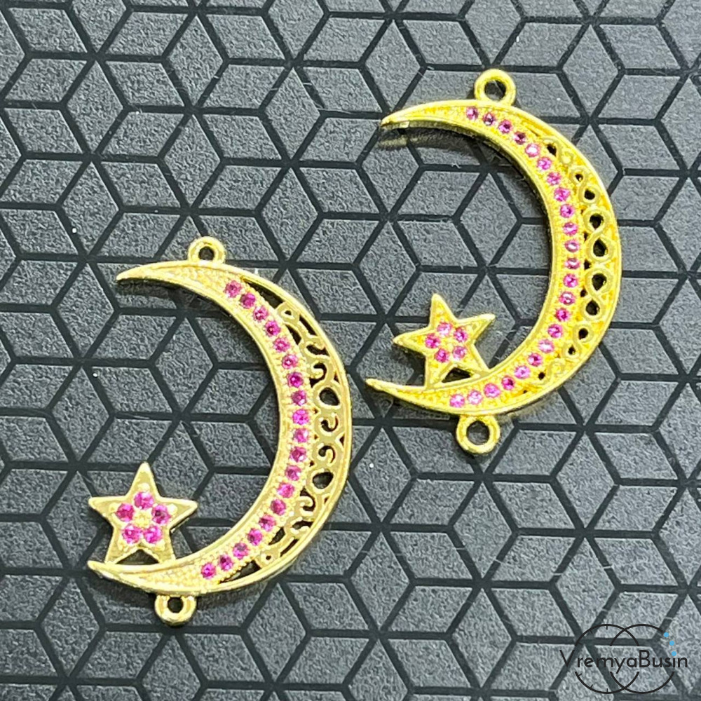 • Коннектор с фианитами "Месяц со звездой", 28х18 мм, латунь с позолотой (1 шт.)