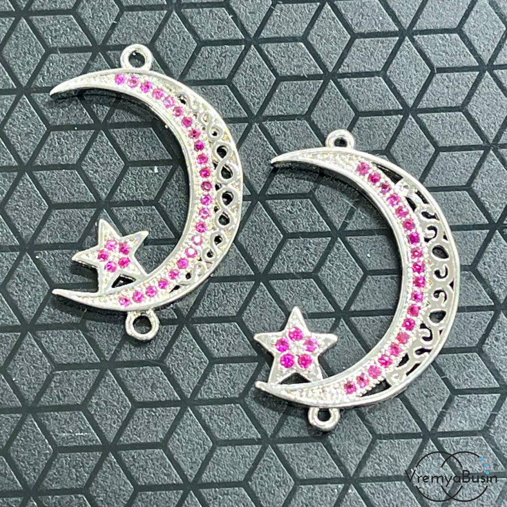 Коннектор с фианитами "Месяц со звездой", 28х18 мм, латунь с родиевым покрытием (1 шт.)