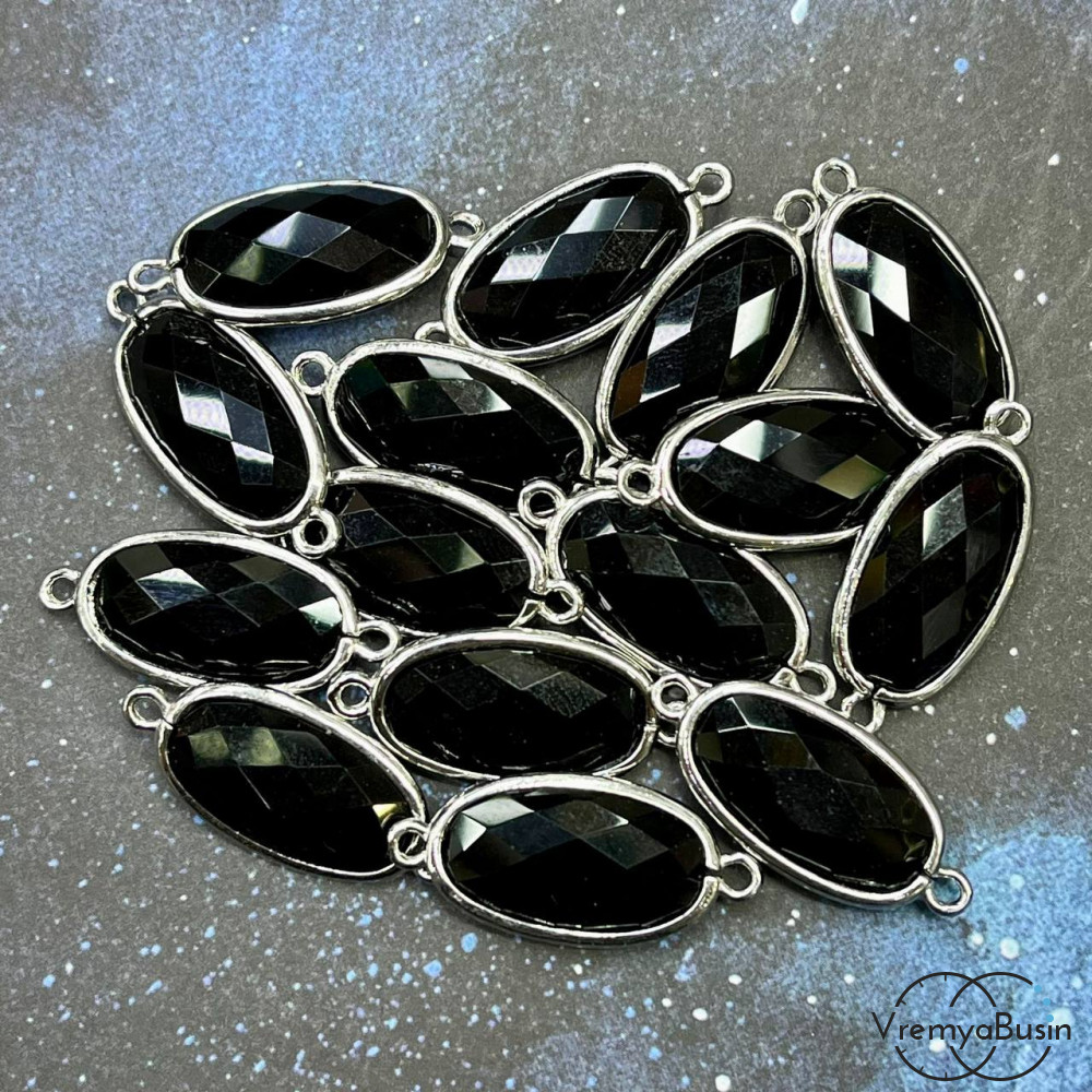 Агат чёрный, коннектор с граненым камнем 28х12 мм в оправе цв. серебро (1 шт.)