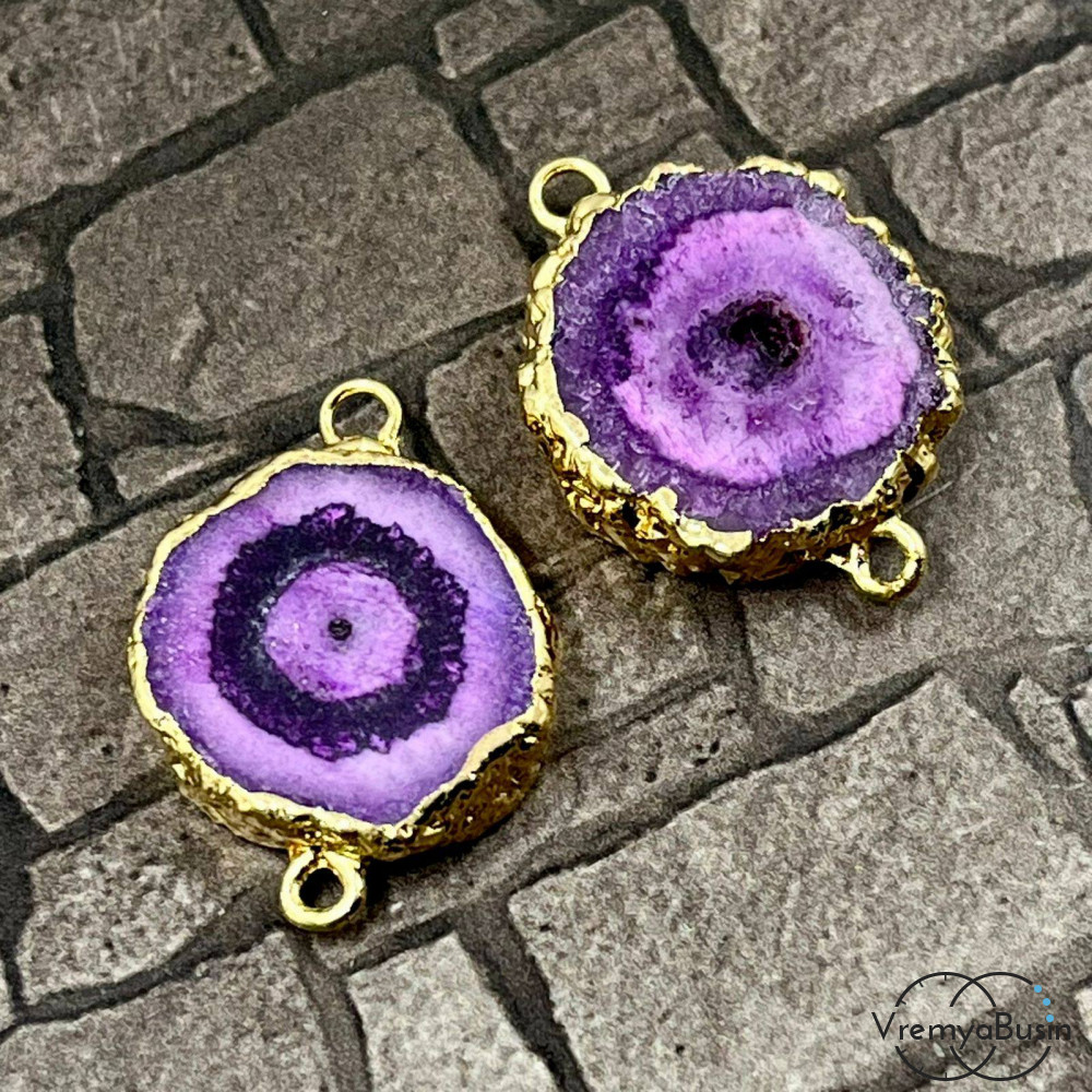 Коннектор из жеоды агата в металле под золото, ок. 20х25 мм, цв. фиолетовый (1 шт.)