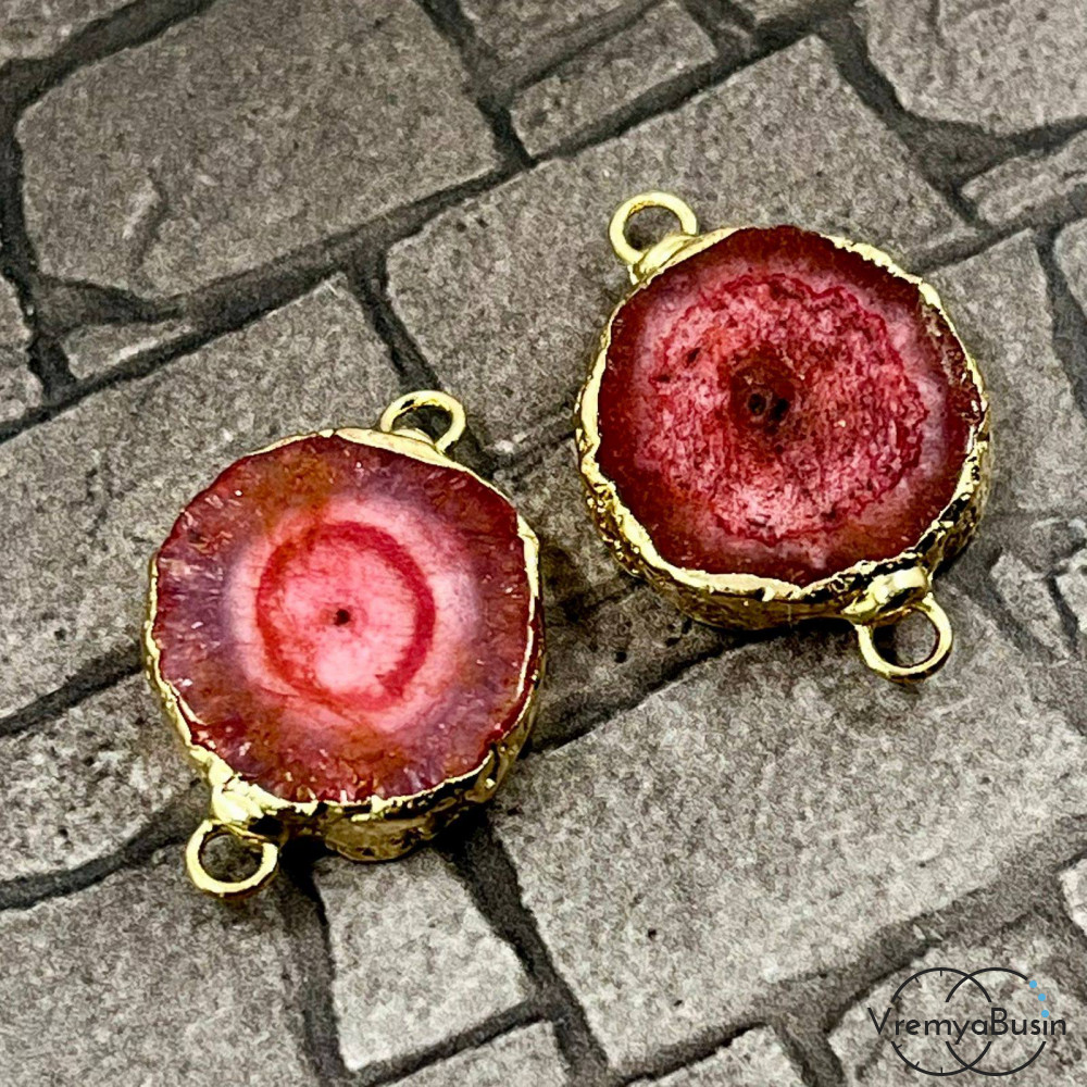 Коннектор из жеоды агата в металле под золото, ок. 20х25 мм, цв. красный (1 шт.)