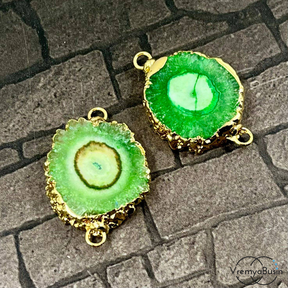 Коннектор из жеоды агата в металле под золото, ок. 20х25 мм, цв. зеленый (1 шт.)
