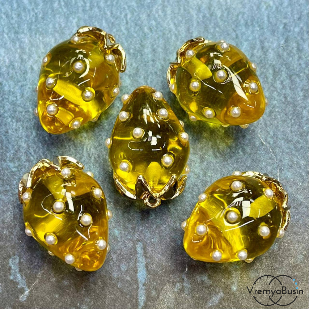 Подвеска из смолы с жемчужинками «Клубничка», ок. 16х24 мм, латунь с позолотой, цв. желтый (1 шт.)’