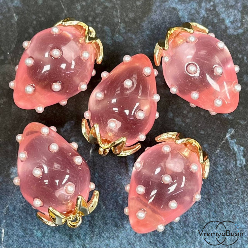 Подвеска из смолы с жемчужинками «Клубничка», ок. 16х24 мм, латунь с позолотой, цв. розовый (1 шт.)’