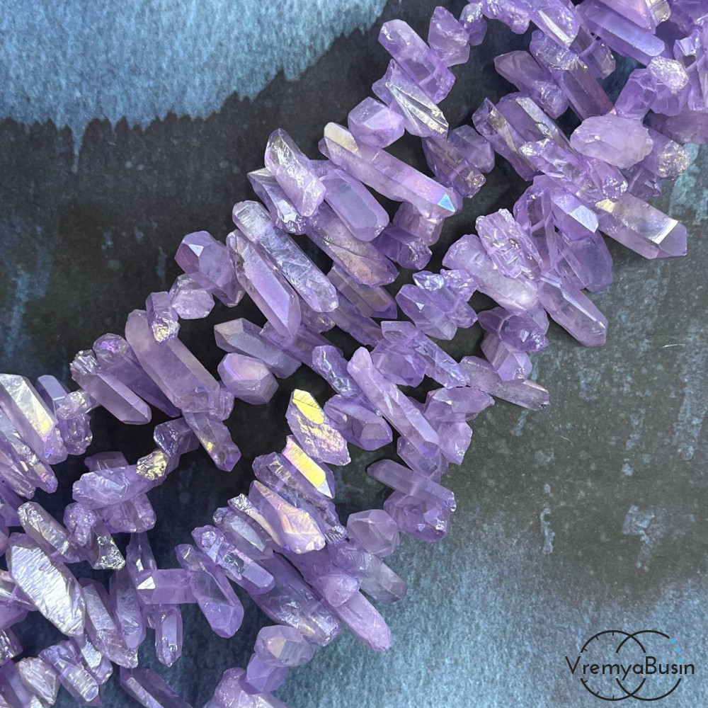 • Кварц радужный, мелкие кристаллы, ок. 20-25х6-7 мм, цв. сиреневый (1/2 нити, ок. 32 шт.)