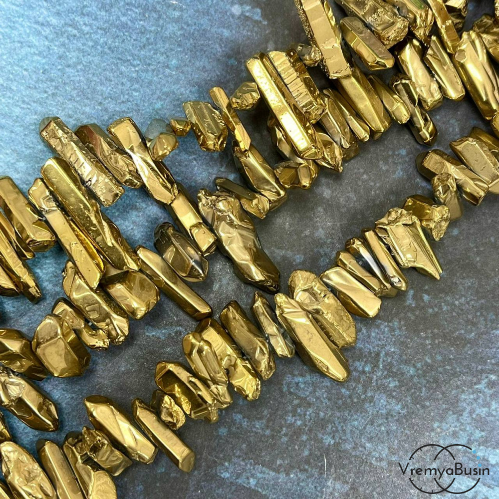 • Кварц тонир., мелкие кристаллы, ок. 20-25х6-7 мм, цв. бензиновый металлик (1/2 нити, ок. 32 шт.)