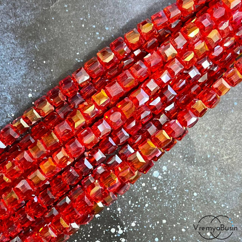 Бусины кубики из граненого стекла, 6 мм, цв. красный с АБ переливом (1/2 нити, ок. 35 шт.)