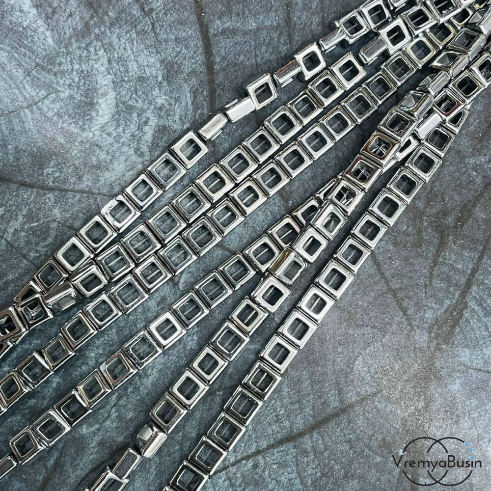 Гематит квадрат, внеш.д. 6 мм / внутр.д. 3 мм, цв. серебро (1/2 нити, ок. 28 шт.)