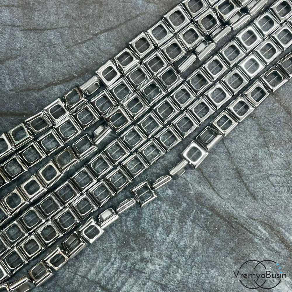 Гематит квадрат, внеш.д. 8 мм / внутр.д. 4 мм, цв. серебро (1/2 нити, ок. 19 шт.)