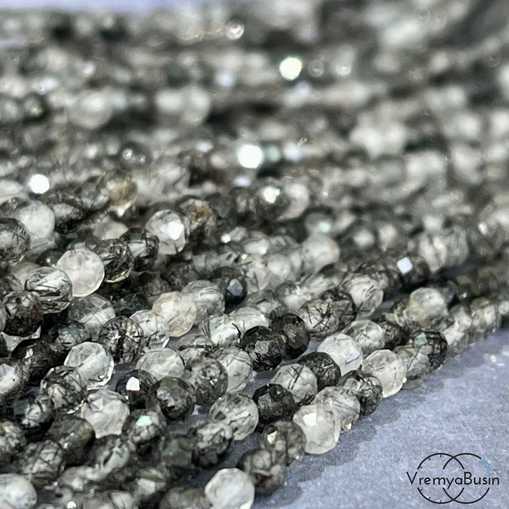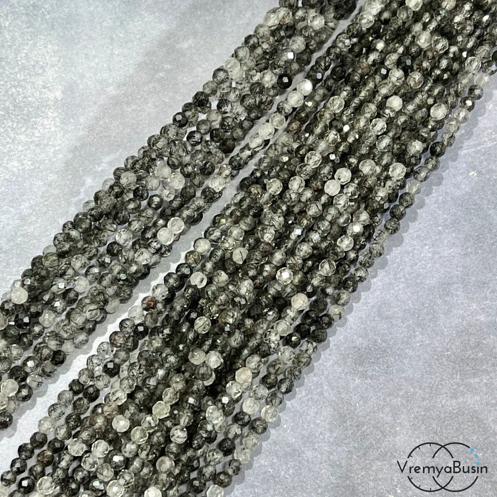 Рутиловый кварц, серый волосатик, самые мелкие граненые бусины из камня, 3 мм ААА качество (нить, ок. 40 см.)