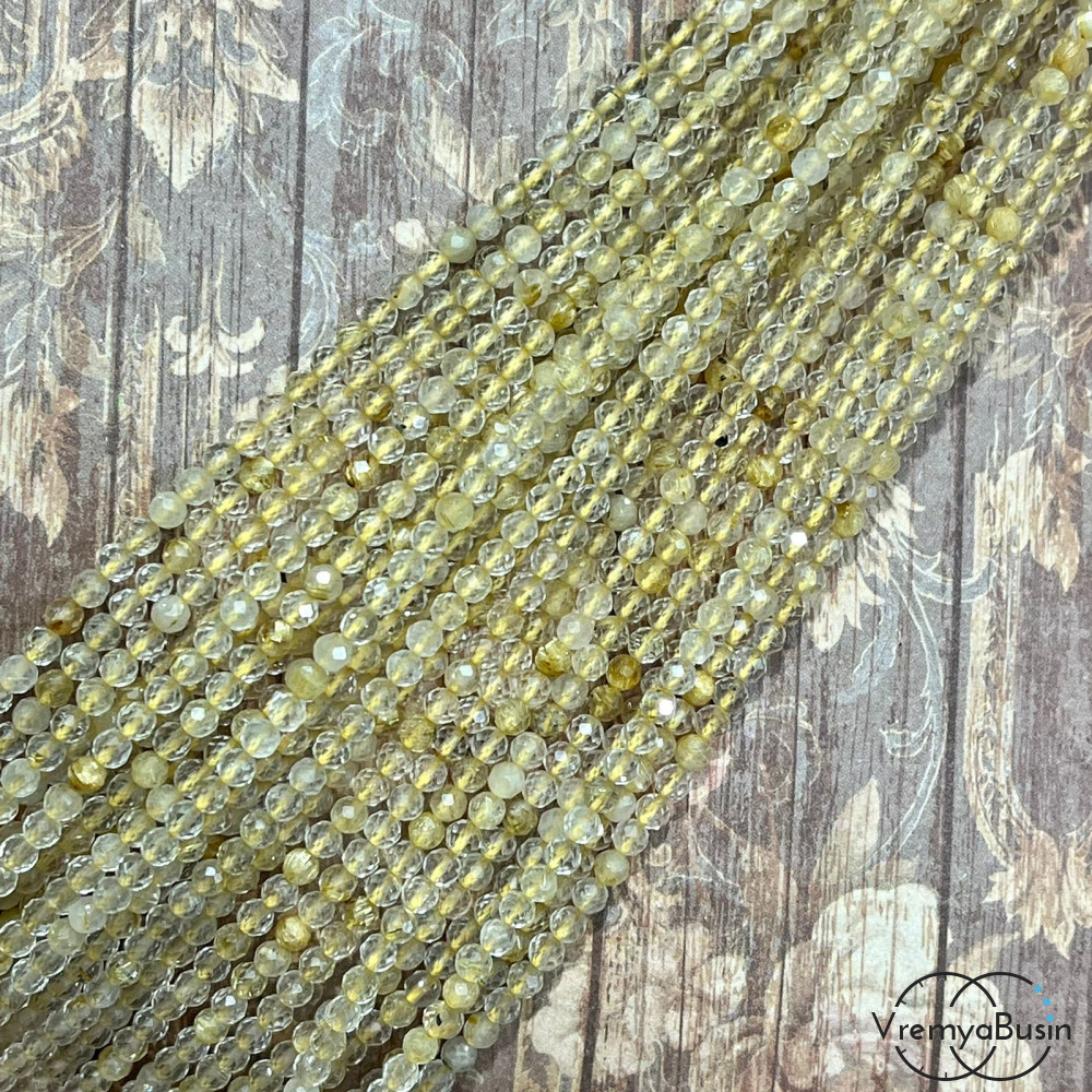Кварц рутиловый, волосатик, самые мелкие граненые бусины из камня, 2.5 мм ААА качество (нить, ок. 40 см.)