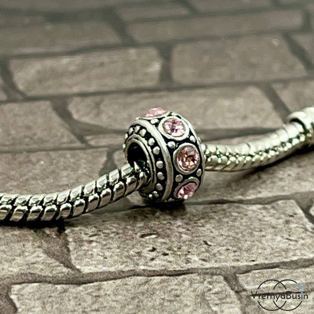 Бусина металлическая со стразами, 10х6 мм, цв. розовый (1 шт.)