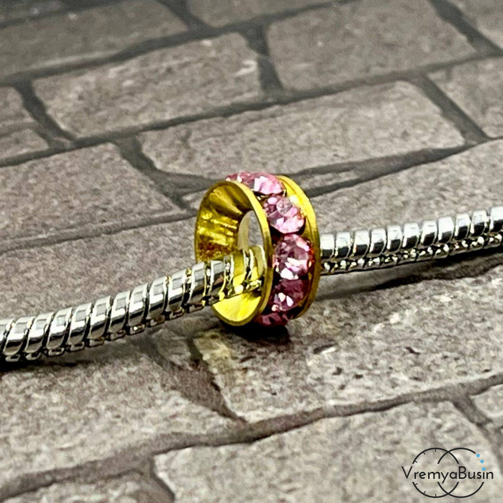 Бусина металлическая со стразами, кольцо 10х4 мм, цв. розовый (1 шт.)