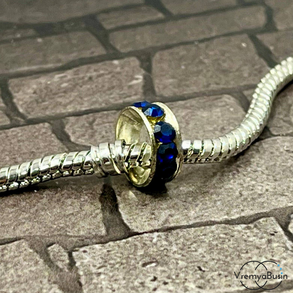 Бусина металлическая со стразами, кольцо 10х4 мм, цв. синий (1 шт.)