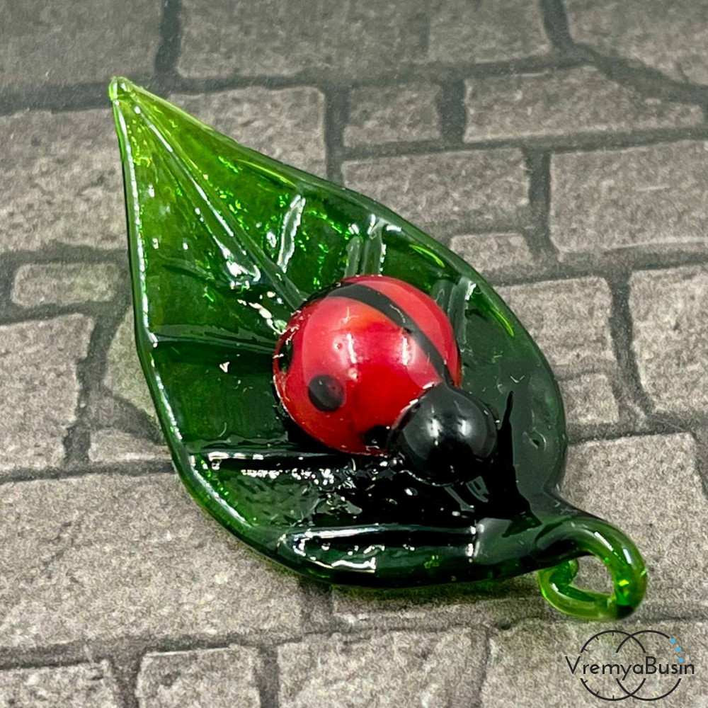 • Подвеска из муранского стекла «Лист с божьей коровкой», ок. 50х25х12 мм (1 шт.)