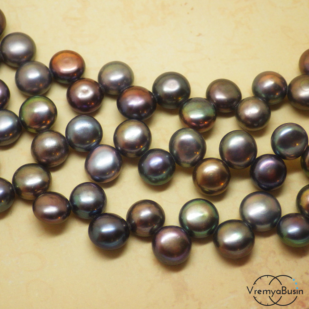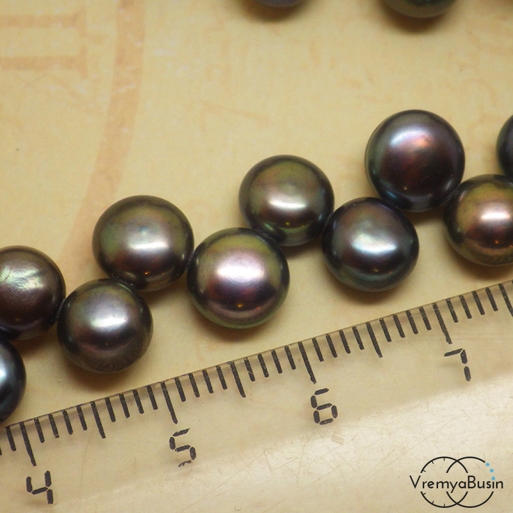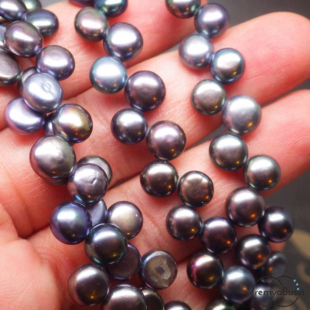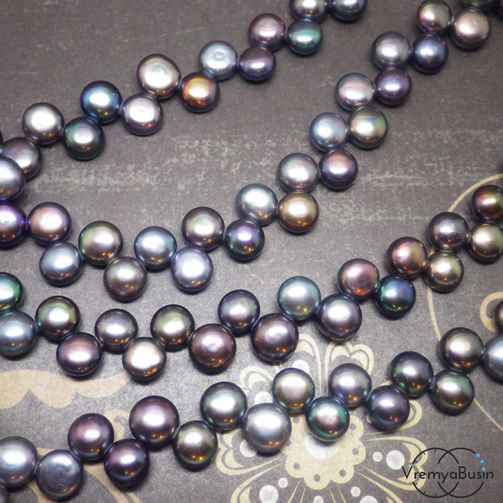 - Жемчуг речной натуральныйЧерного цвета с переливом стальным и фиолетовымКруглые чуть плоские бусины с дырочкой поперек в верхней частиНа нити располагаются в шахматном порядке, образуя змейкуРазмер около 6-7 мм, см. доп.фотоЦена указана за 1 шт.